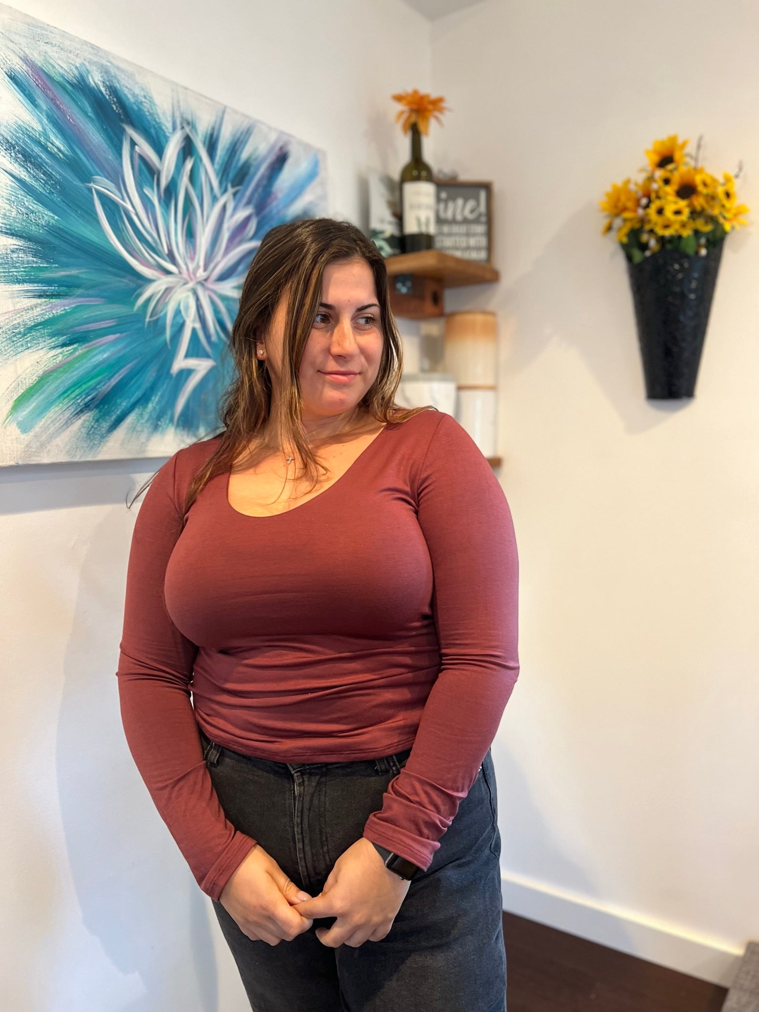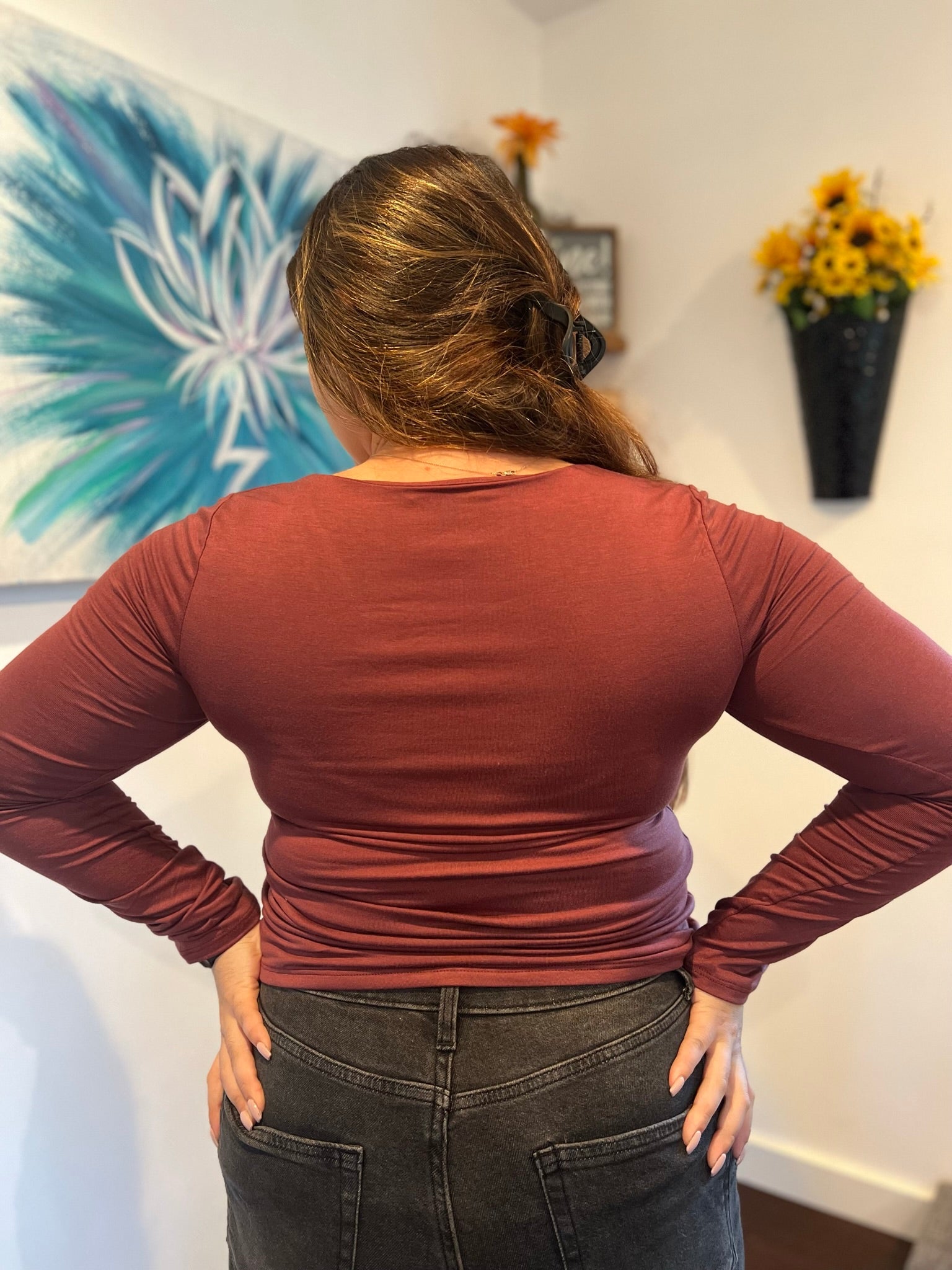 Fall head over heels for this maroon long sleeve top! It's impossibly soft and fits like a dream, while the low neckline adds a flirty element that will make you look fabulous. Don't be surprised when you fall in love at first sight!